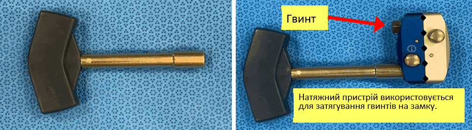 - Натяжний пристрій. Затягує гвинти на замках для фіксації положення стержнів і штанг.