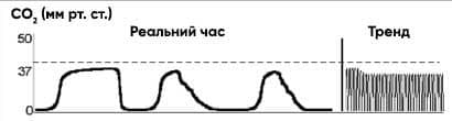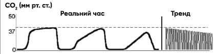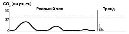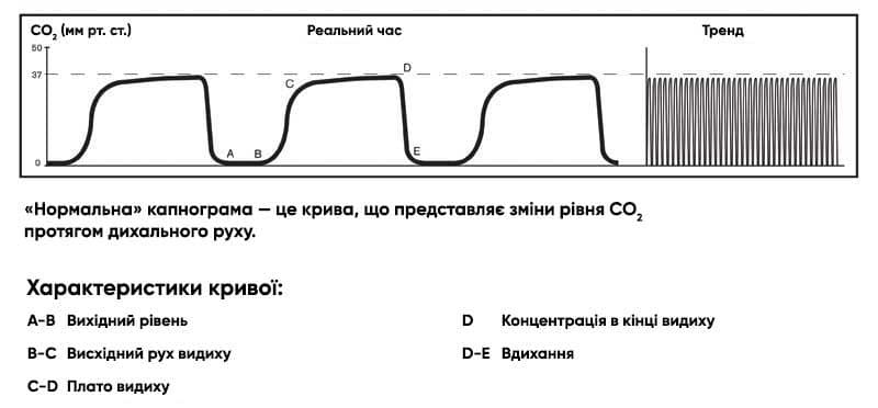 - CO2 в кінці видиху (ETCO2): Показник концентрації вуглекислого газу в кінці видиху. Нормальні значення містяться в діапазоні 35–45 мм рт. ст. Аналіз газів, що видихаються, виконується або за допомогою монітора для контролю життєво важливих показників, або портативних пристроїв ETCO2 (наприклад, EMMA); використання кількісного капнографа або капнометра належить до клінічного стандарту лікування пацієнтів, яким виконується інвазивна вентиляція легень.