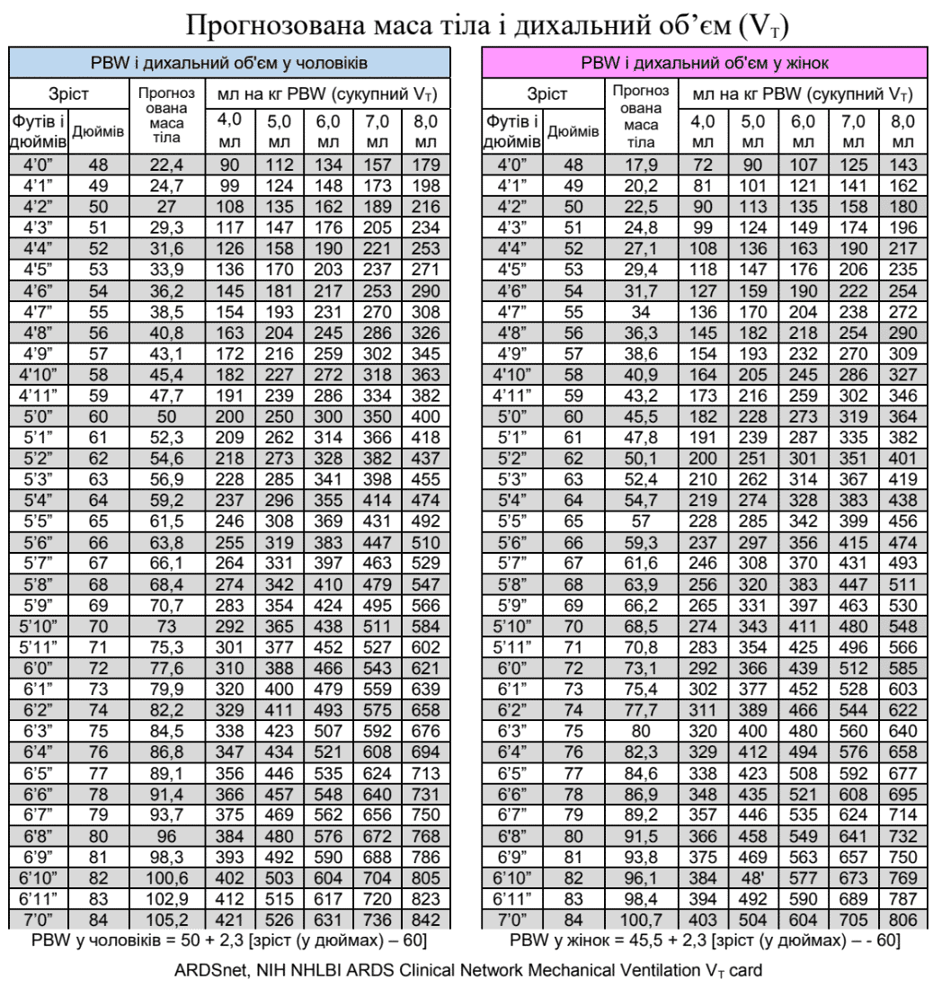 - ІдеальнаIBW: показник маси тіла, на основі якого обчислюється дихальний об’єм замість використання фактичної маси тіла. Це дозволяє застосовувати стратегію вентиляції із захистом легень. Довідкова таблиця наведена в Додатку A. IBW можна обчислити вручну вказаним нижче способом.