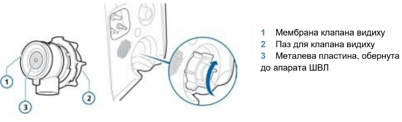ЗАСТЕРЕЖЕННЯ Закривання бічних портів «Gas Out» дозволить апарату ШВЛ забезпечувати повні дихальні рухи, однак це відключить функцію запобігання асфіксії, яку забезпечують ці порти. Несправність апарата ШВЛ призведе до збільшення опору при спонтанному диханні, тому за роботою апарата необхідно забезпечити ретельний нагляд, щоб негайно виявляти будь-яку подальшу несправність. У разі несправності пацієнтів слід негайно перевести на ручну вентиляцію легень.