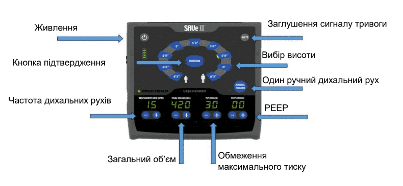 ПРИМІТКА. SAVe II призначений для використання замість мішка Амбу у догоспітальному середовищі. Він використовується для забезпечення підтримки дихання або вентиляції з позитивним тиском (PPV) у дорослих з масою тіла > 45 кг (99 фунтів).