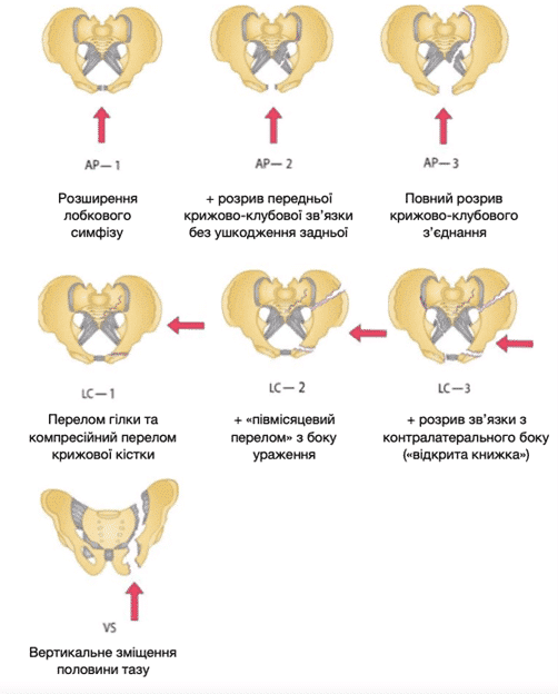 Класифікація Young-Burgess (Зобр. 1) зазвичай використовується для опису механізму і характеру травми у пацієнтів з переломами кісток таза. Можливі також комбіновані травми.