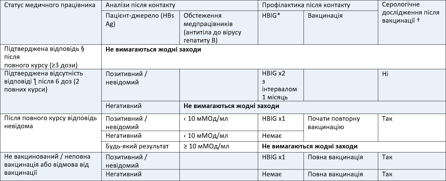 † Слід виконувати через 1–2 місяці після введення останньої дози вакцини від гепатиту В (і через 4–6 місяців після введення HBIG, щоб уникнути виявлення пасивно введених антитіл до вірусу гепатиту B) із застосуванням кількісного методу, який дозволяє виявити захисну концентрацію антитіл до вірусу гепатиту B (≥10 мМОд/мл)