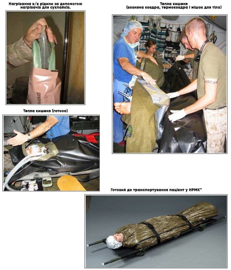 - Крім того, увесь персонал, залучений до лікування та евакуації поранених бійців, повинен ознайомитися з альтернативними та польовими заходами профілактики гіпотермії, а також пристроями і методами, описаними в Додатку А.