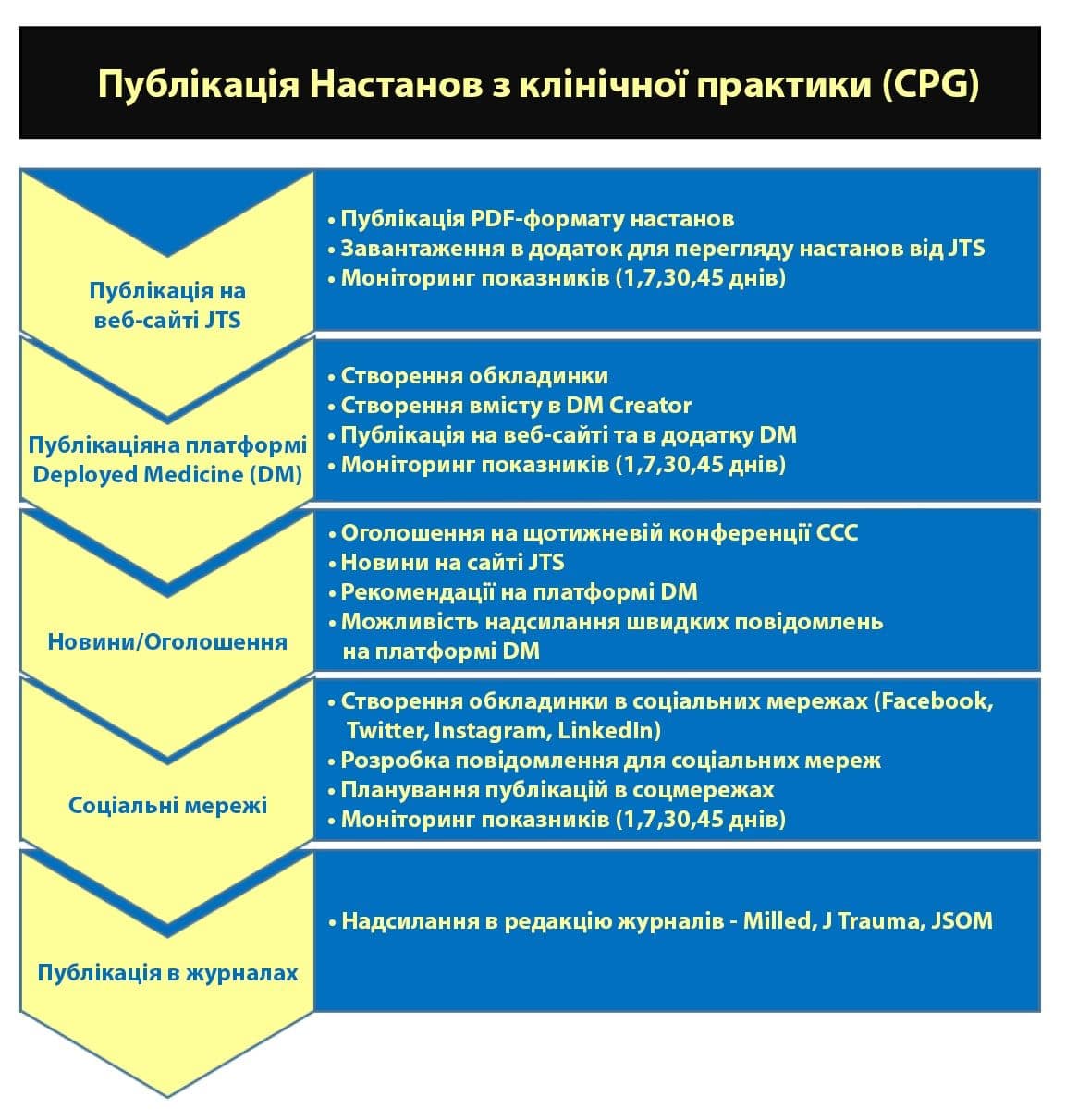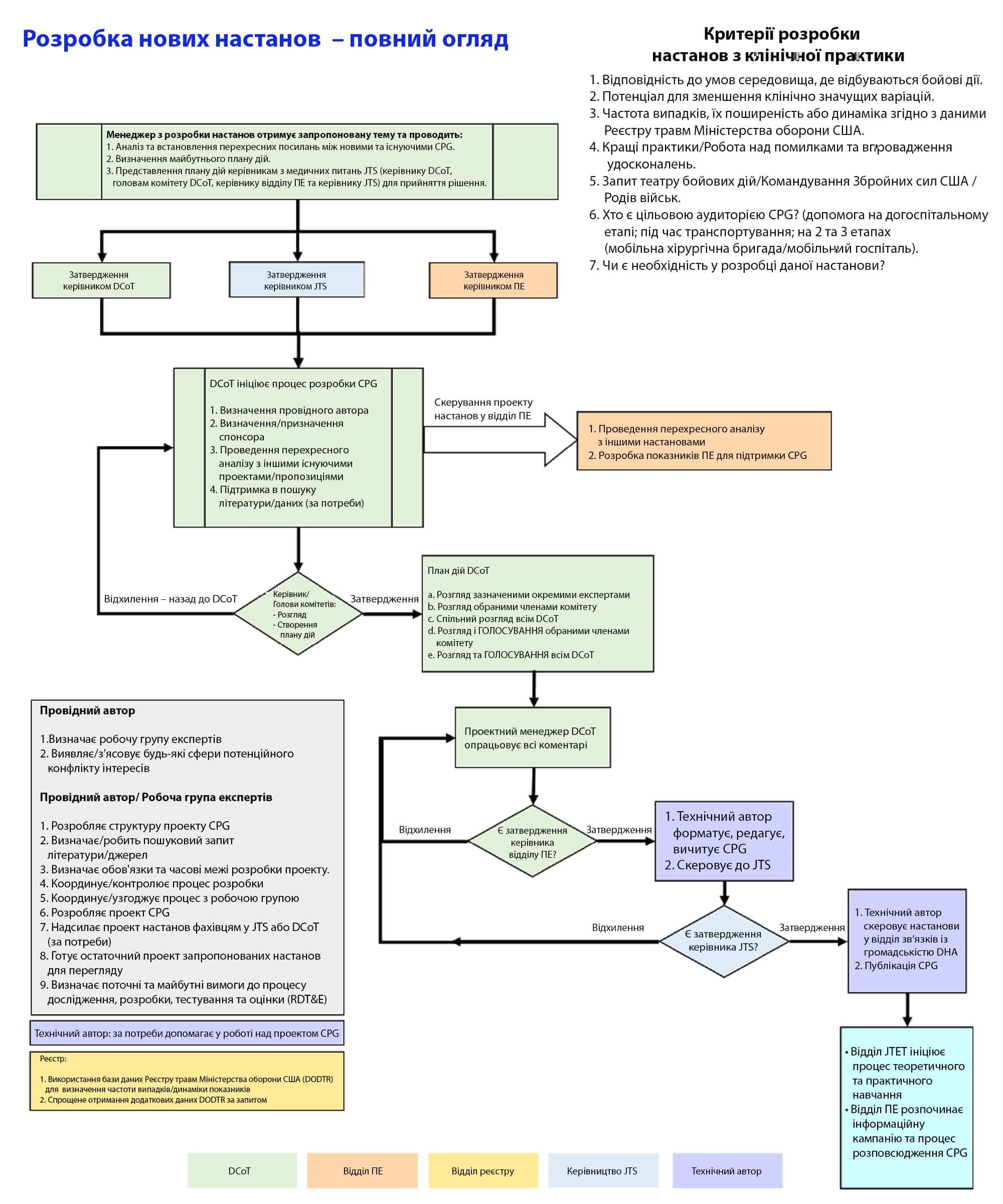- Після затвердження CPG проходять перевірку PAO/OPSEC, після чого публікуються на веб-сторінці JTS CPG і Deployed Medicine.