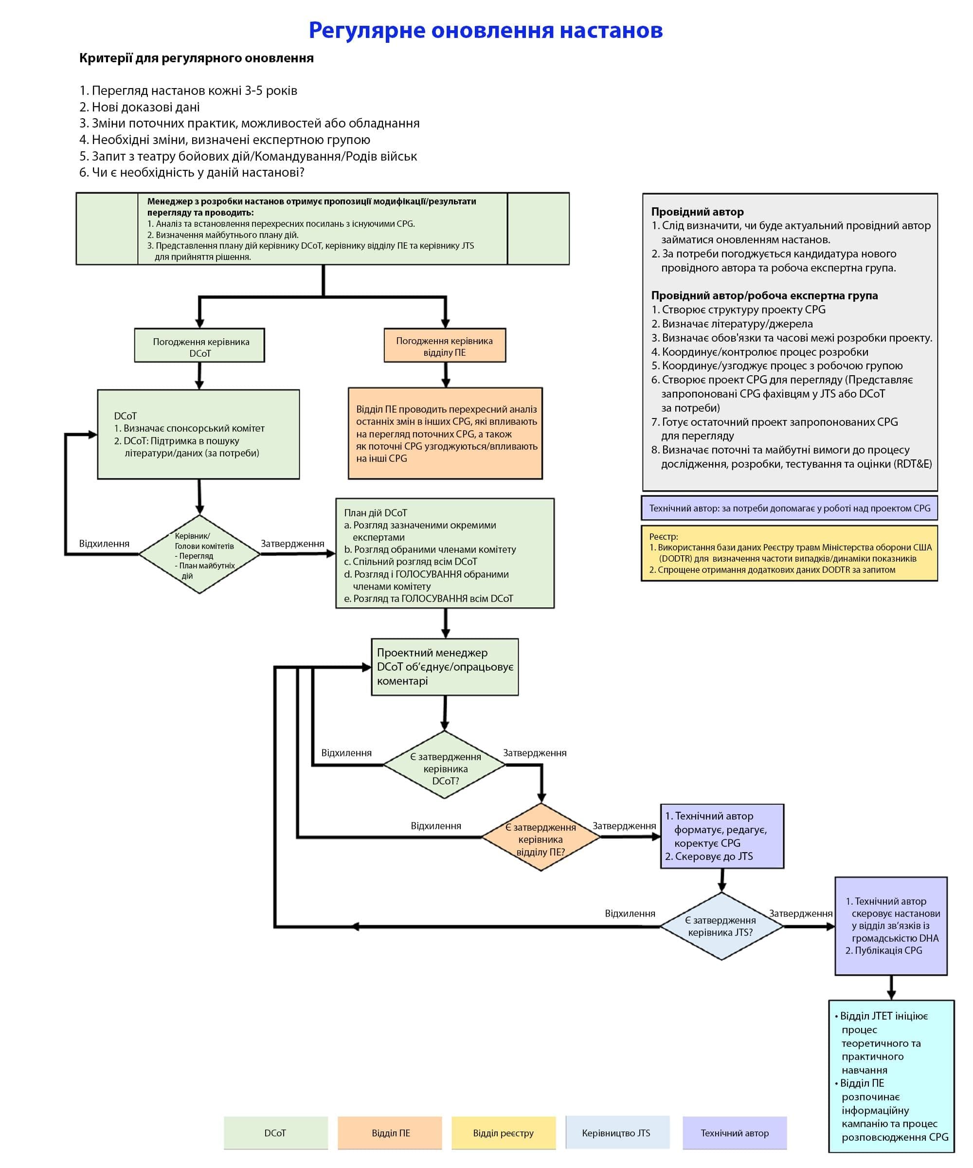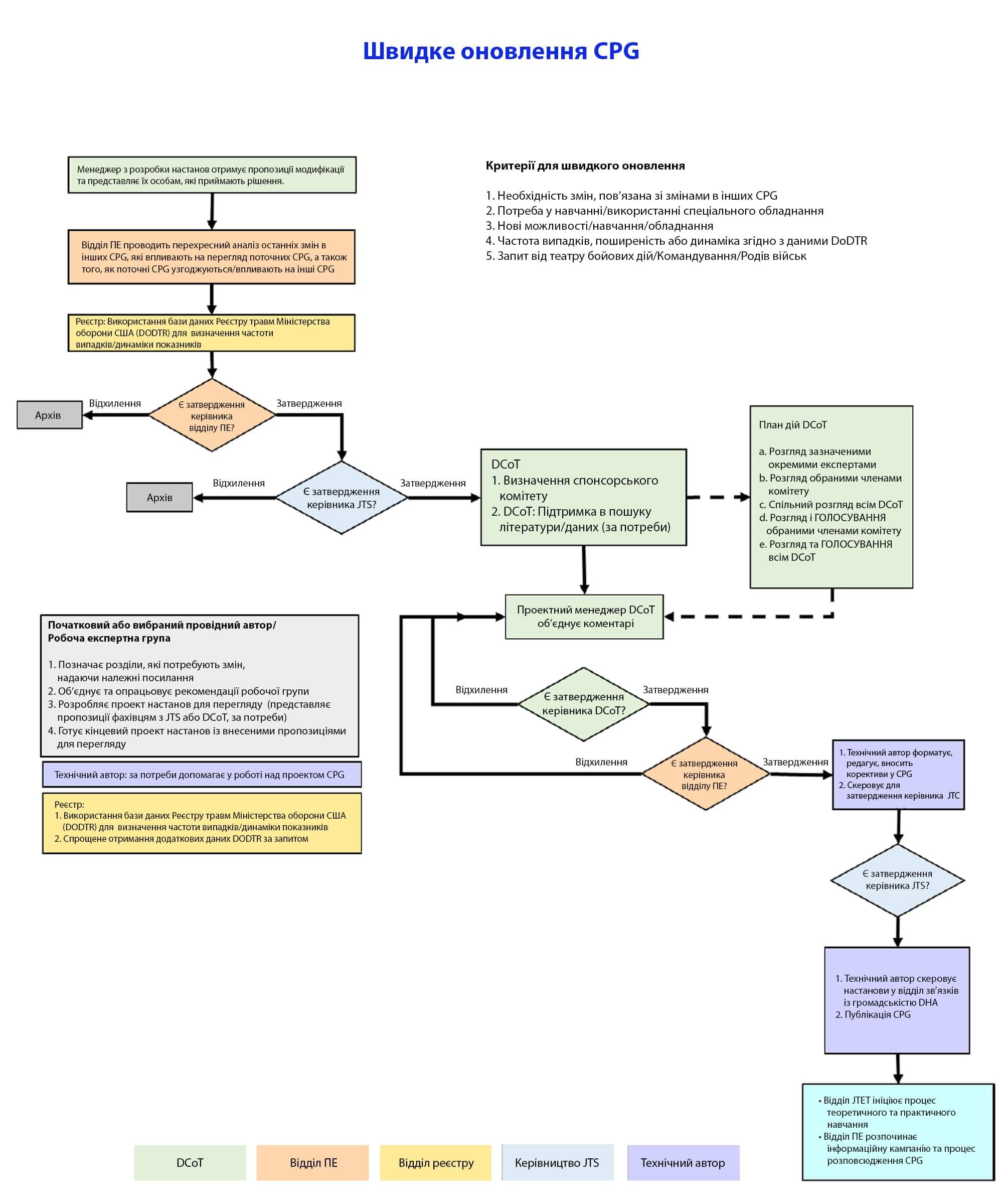 - Керівник відділу підвищення ефективності JTS/DCoT затверджує всі пропозиції щодо швидких/періодичних оновлень, клінічних удосконалень, конкретних соціальних груп та операційних міркувань для окремих CPG. Після затвердження відбувається скорочений процес перегляду для швидкого оновлення, який не змінює дату публікації CPG. (Деталі процесу див. у Додатках A, B, C) Провідний автор і редакційна робоча група переглядають ці оновлення та приймають рішення щодо включення їх у настанови. Оновлені CPG надсилаються керівнику відділу ПЕ JTS/керівнику(ам) DCoT для схвалення перед відправленням керівнику JTS для остаточного затвердження.