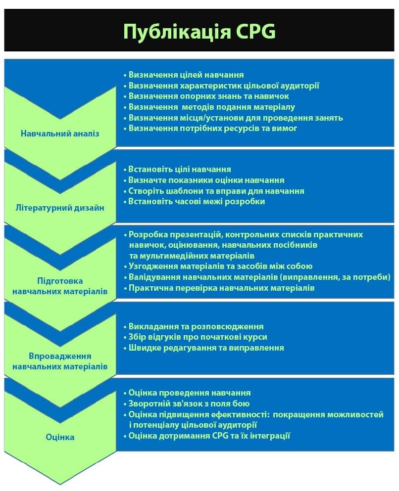 - Цільової аудиторії CPG (допомога на догоспітальному етапі, під час транспортування, на 2 та 3 етапах (мобільна хірургічна бригада/мобільний госпіталь).