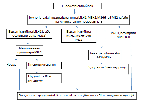 Хоча більшість випадків РЕ спричинені спорадичними мутаціями, спадкові генетичні мутації відповідають приблизно за 5% РЕ. NCCN рекомендує універсальне тестування пухлини на дефектні гени репарації невідповідності ДНК (MMR) за допомогою імуногістохімії та/або тестування мікросателітної нестабільності. Слід протестувати чотири основні генні локуси, включаючи MLH1, MSH2, MSH6 і PMS2. Зазвичай тестування проводиться на остаточному зразку після гістеректомії, хоча це може бути зроблено зі зразка біопсії перед операцією, якщо гістеректомія не виконується. Якщо є втрата MLH1, це слід додатково оцінити для метилювання промотора, щоб визначити, чи є епігенетичний процес відповідальним за втрату, а не мутація зародкової лінії. Генетичне консультування має відбуватися для всіх інших аномалій MMR, крім тих жінок, у сімейному анамнезі яких є ознаки синдрому Лінча (Зобр. 2). Тестування зародкової лінії на синдром Лінча може інформувати пацієнтів про ризик інших видів раку (колоректального та яєчників), а також інформувати членів родини пацієнта про потенційний ризик раку.