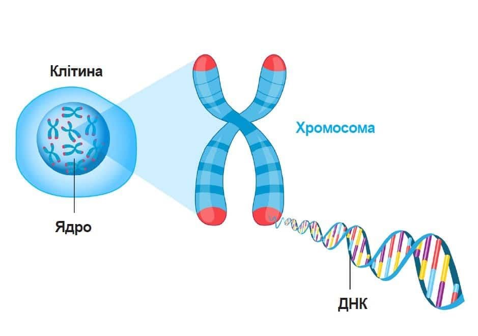 Більшість клітин людини запрограмовані на те, що називається «програмою життя». Це програма створення та функціонування нашого організму. Вона розташована всередині хромосом. Хромосоми — це довгі нитки ДНК, які щільно обгорTнуті навколо білків. Гени — це невеликі частинки ДНК. Людина має від 20 000 до 25 000 генів.