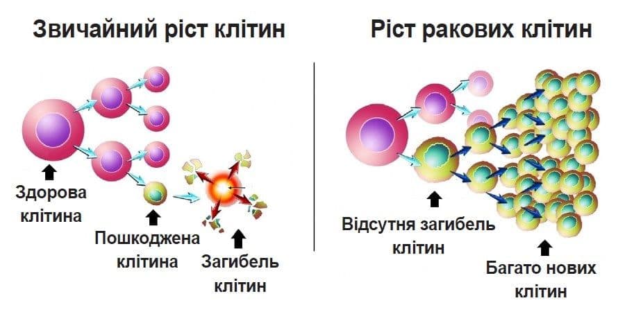 - Ракові клітини утворюють пухлину, оскільки процеси росту та вмирання в цих клітинах відбуваються в інший спосіб, ніж у здорових клітинах.