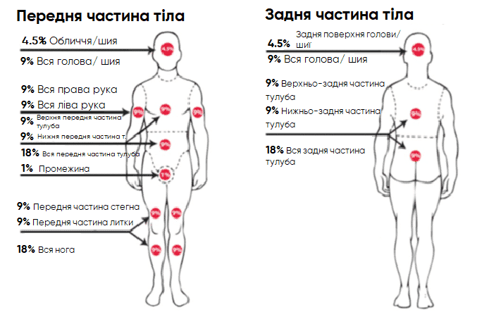 - Щоб оцінити загальну площу поверхні тіла (ППТ), ураженої опіком, використовуйте «правило дев’ятки» або метод долоні (Рисунок 1). Примітка: підраховуються лише опіки 2 та 3 ступеня.