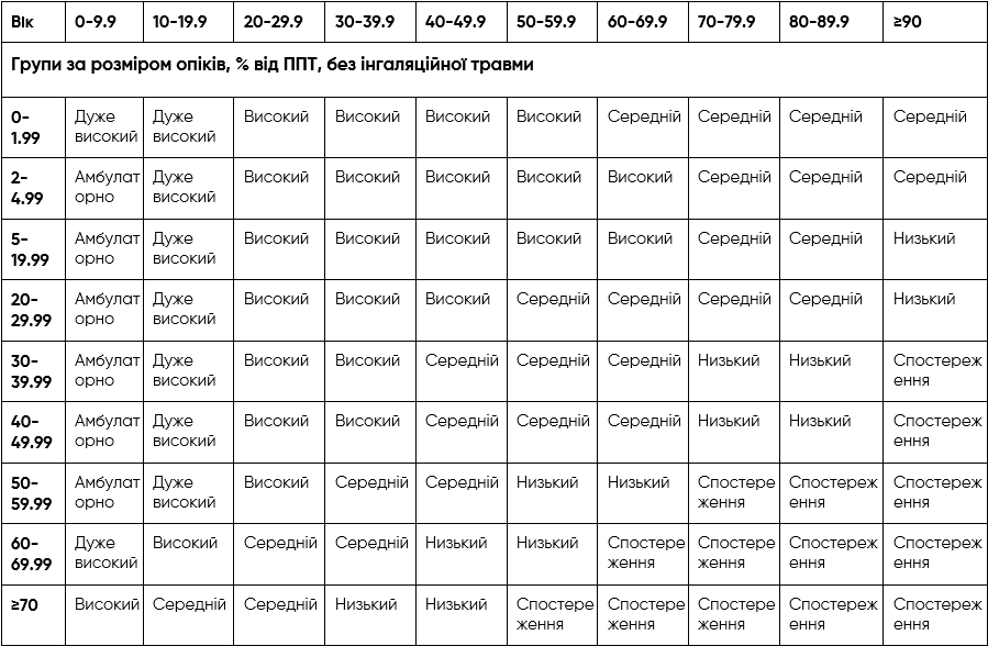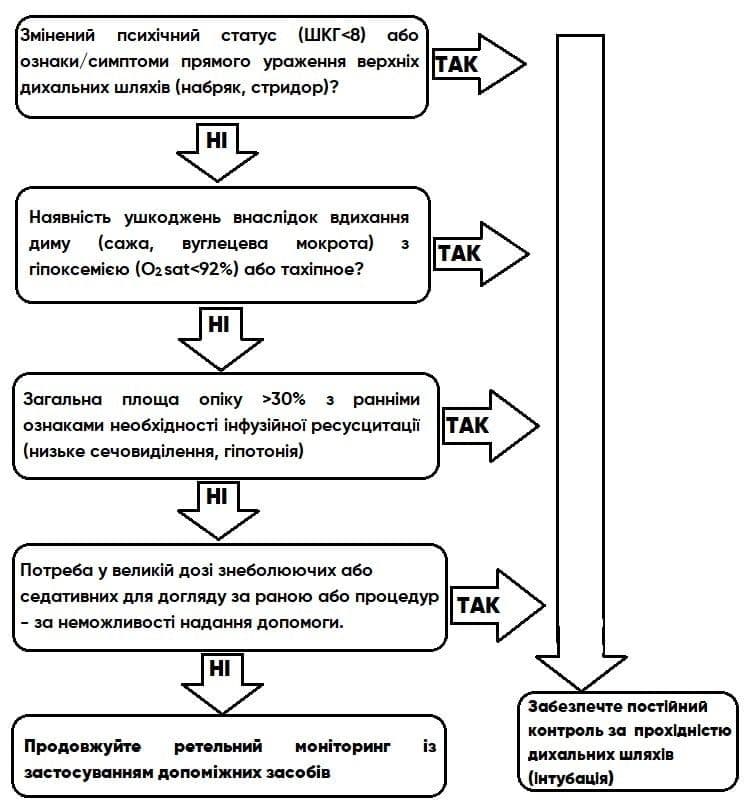 - Якщо можливості медичного закладу не відповідають наявним потребам, проведіть сортування відповідно до «Діаграми сортування ресурсів для опікової травми під час катастрофи» (див. Додаток).