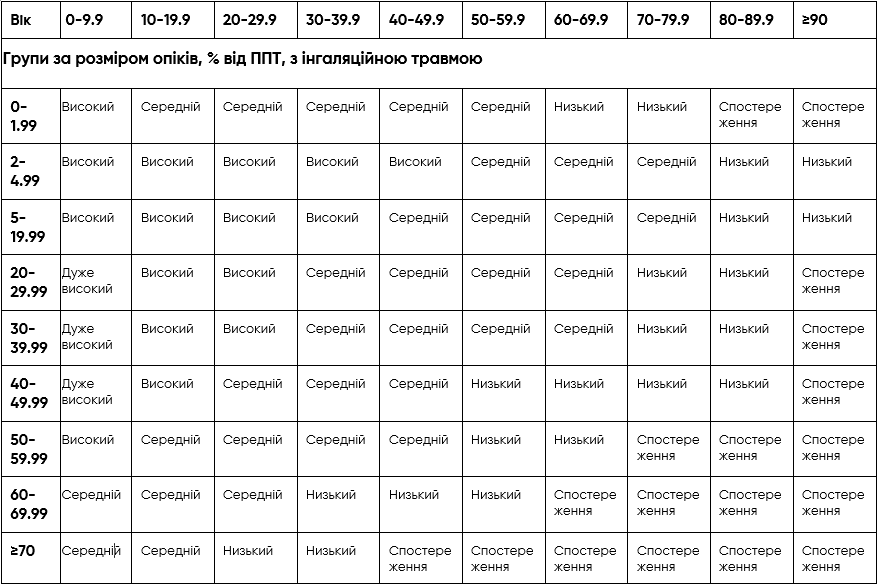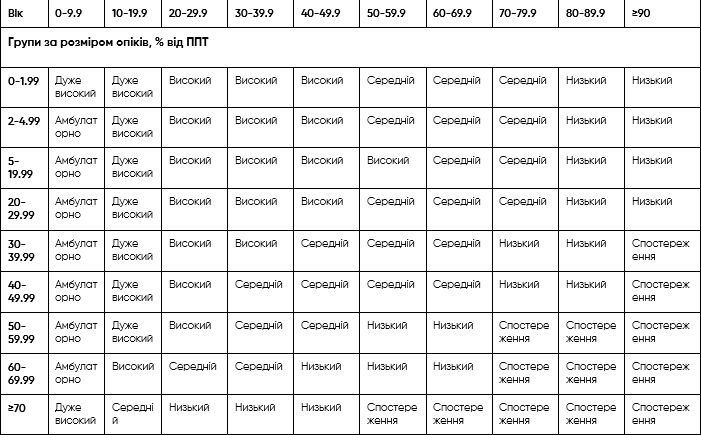 Таблиця 1. Діаграма розподілу ресурсів для опіків в умовах катастрофи.