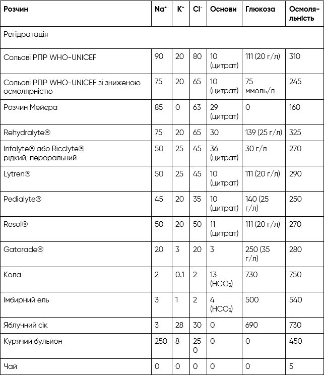 Таблиця 2. Склад пероральних глюкозо-електролітних розчинів та прозорих рідин