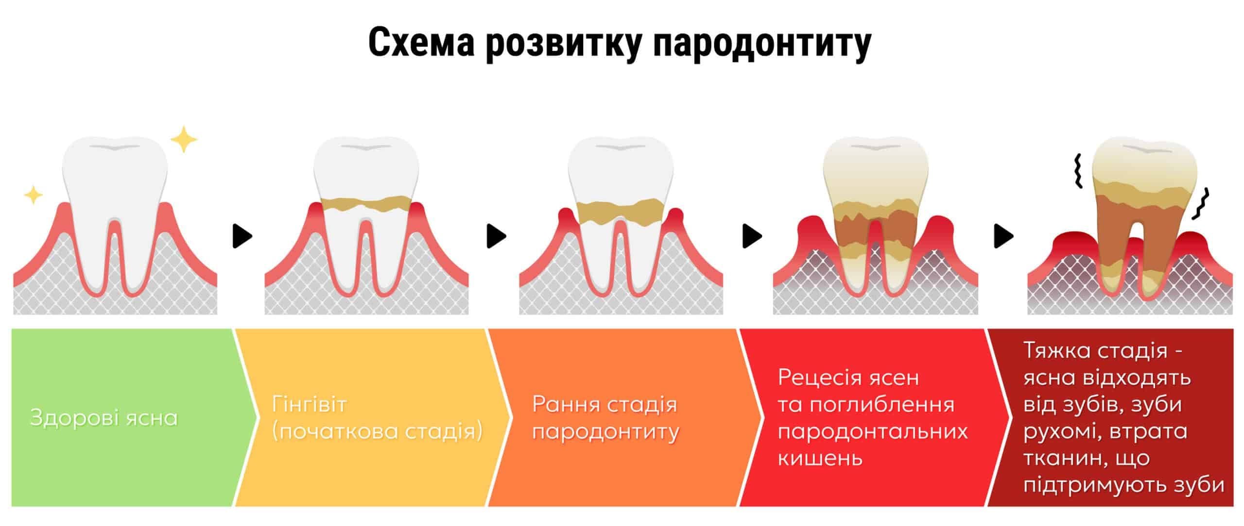 Пародонтит зазвичай починається з гінгівіту — запалення ясен, пов’язаного з накопиченням зубного нальоту. Якщо гінгівіт не лікувати, він може прогресувати до пародонтиту.