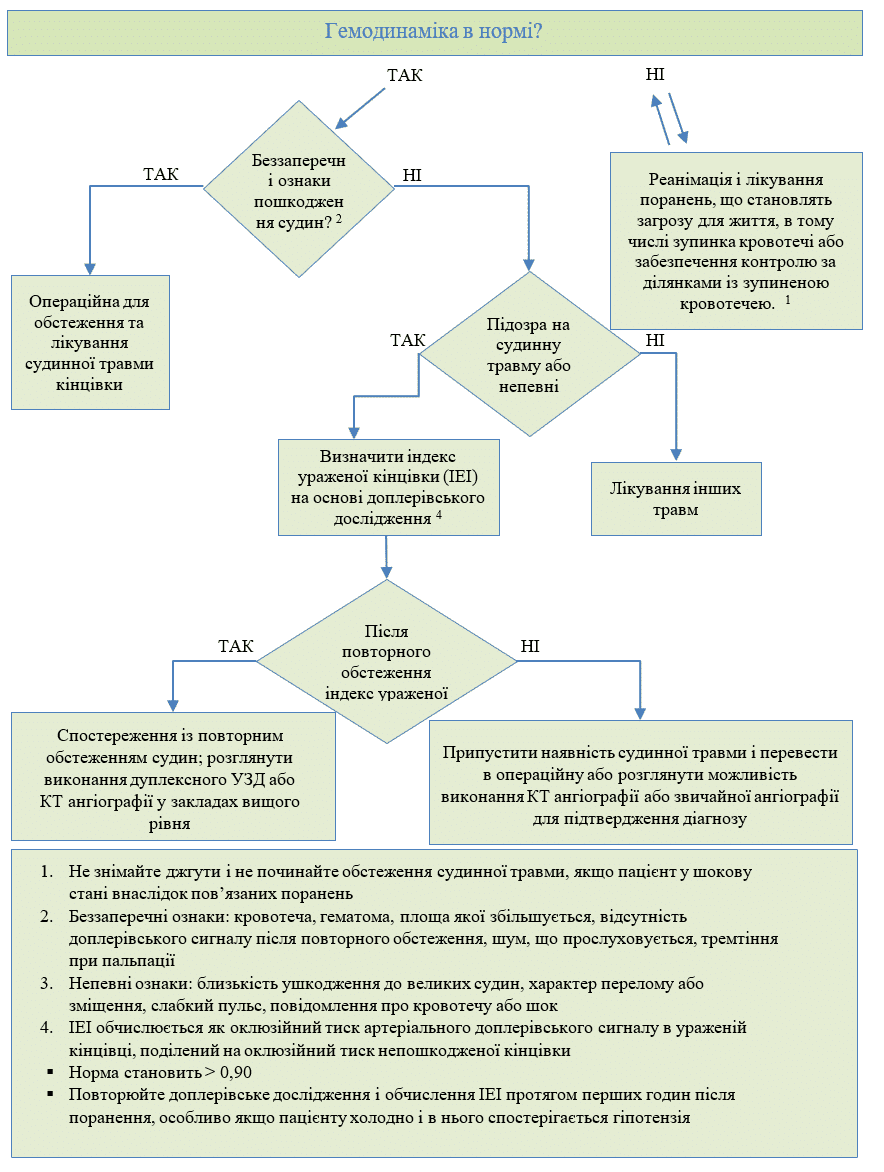 - У разі непевних ознак, таких як значна кровотеча в анамнезі, близькість ушкодження до великих судин (характер перелому, зміщення, проникаюче поранення або вибухова травма), утворення синців чи гематома, або сумнівів щодо наявності або відсутності пульсу, що прощупується, слід виконати інше діагностичне обстеження. Зазвичай таким діагностичним обстеженням є доплерівське дослідження із обчисленням, за можливості, індексу ураженої кінцівки, а також КТ ангіографія чи звичайна ангіографія у разі підозри на судинні травми тулуба та (або) кінцівок, якщо ці методи доступні.