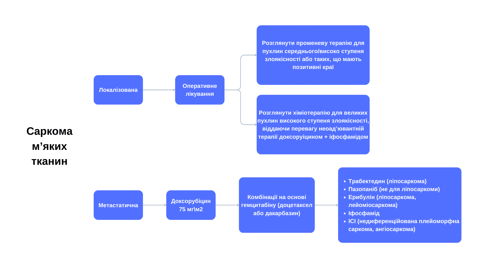 Саркоми є гетерогенною групою захворювань, для лікування яких часто застосовують системну терапію. При локалізованих саркомах хірургічне втручання з лікувальною метою є основним методом лікування більшості підтипів, а променева терапія застосовується як неоад’ювантна або ад’ювантна терапія при відповідних клінічних сценаріях/показаннях.