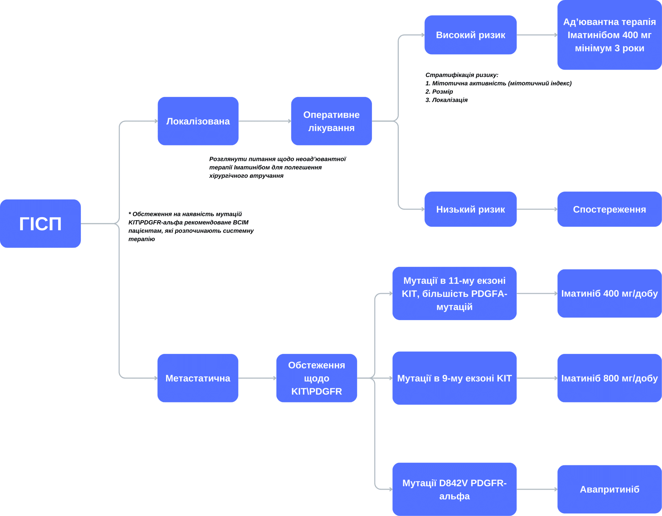 За наявності технічних можливостей тестування на мутації KIT та PDGFR-альфа слід проводити всім пацієнтам, для яких розглядається варіант системної терапії з використанням ТКІ. 80% пацієнтів матимуть мутації в KIT, причому найпоширенішими є мутації первинного драйвера в 11-му екзоні KIT, за якими слідують мутації в 9-му екзоні KIT. Слід зазначити, що пацієнти з мутацією 9-го екзону KIT потребують вищої добової дози іматинібу, а саме 800 мг на добу. 10% пацієнтів матимуть мутації в PDGFR-альфа, більшість з яких також чутливі до 400 мг іматинібу. Однак зараз доведено, що деякі мутації в 18-му екзоні PDGFR-альфа (особливо D842V) спричиняють резистентність до іматинібу. Було розроблено кілька ТКІ, які мають активність проти цієї мутації: на даний момент у США схвалили авапритиніб як препарат для початкового лікування нерезектабельної або метастатичної ГІСП з мутацією екзону 18 PDGFR-альфа, завдяки загальній частоті відповіді на препарат, що складає 86% у цій популяції [24].