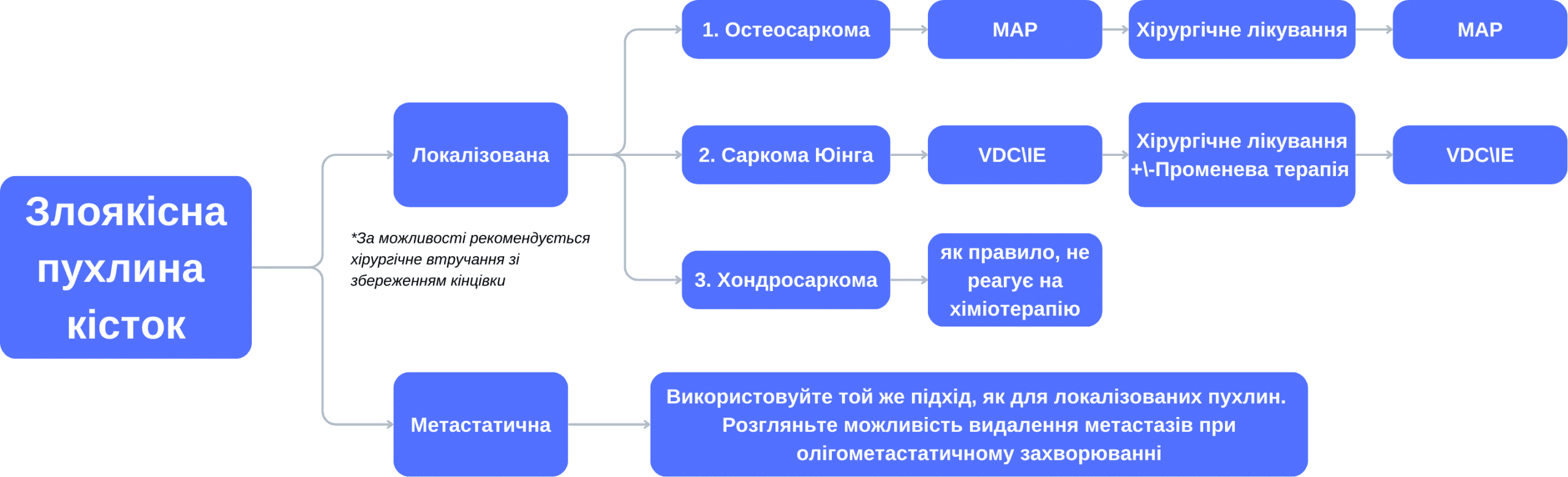Дослідження EURAMOS визначило 10-тижневий курс неоад’ювантної терапії доксорубіцином, цисплатином і метотрексатом з подальшим хірургічним втручанням (якщо можливо, зі збереженням кінцівки) і додатковою ад’ювантною хіміотерапією як метод вибору при лікуванні локалізованої остеосаркоми [35]. Хіміотерапія при метастатичному захворюванні є такою ж, як і при локалізованому захворюванні, але проводиться з паліативною метою. Після прогресування хвороби на тлі хіміотерапії першої лінії, можливими варіантами з продемонстрованою ефективністю є високі дози іфосфаміду [36], схеми на основі гемцитабіну [37] та регорафенібу [38]. Остеосаркома вважається резистентною до променевої терапії пухлиною, хоча опромінення може застосовуватися у випадках, коли інші варіанти лікування вже вичерпані.