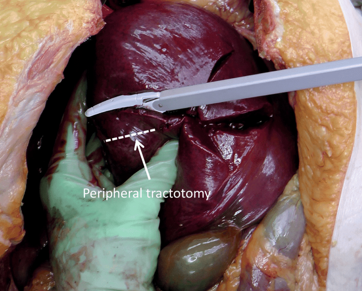 Потім цей «язик» сальника упаковується в паренхіму печінки. У багатьох випадках це найкращий метод, оскільки він використовує добре васкуляризовану тканину з великою кількістю активних макрофагів для заповнення мертвого простору, що забезпечує найбільший гемостатичний ефект. Проникаючі поранення печінки (наприклад, глибокі ножові або кульові поранення) створюють особливо складну ситуацію через утворення раньового каналу (тракту), до якого зазвичай важко отримати доступ і який важко затампонувати. Пошкодження периферичних трактів можна лікувати за допомогою трактотомії степлером або електрокаутерним біполярним запаювачем судин (тобто LigaSure). Послідовне використання степлера або біполярного пристрою вздовж раньового каналу забезпечує гемостаз і надає доступ до глибших ушкоджень, раніше візуально прихованих.