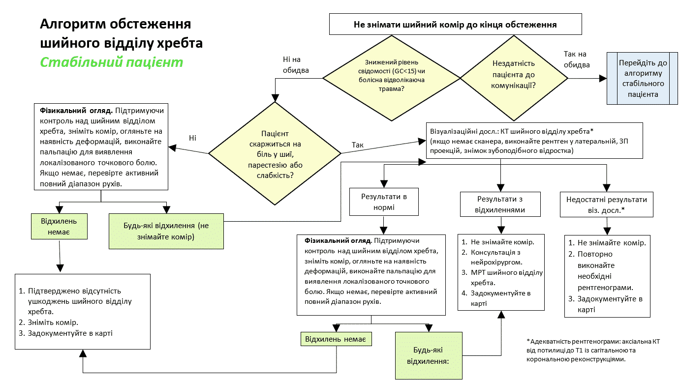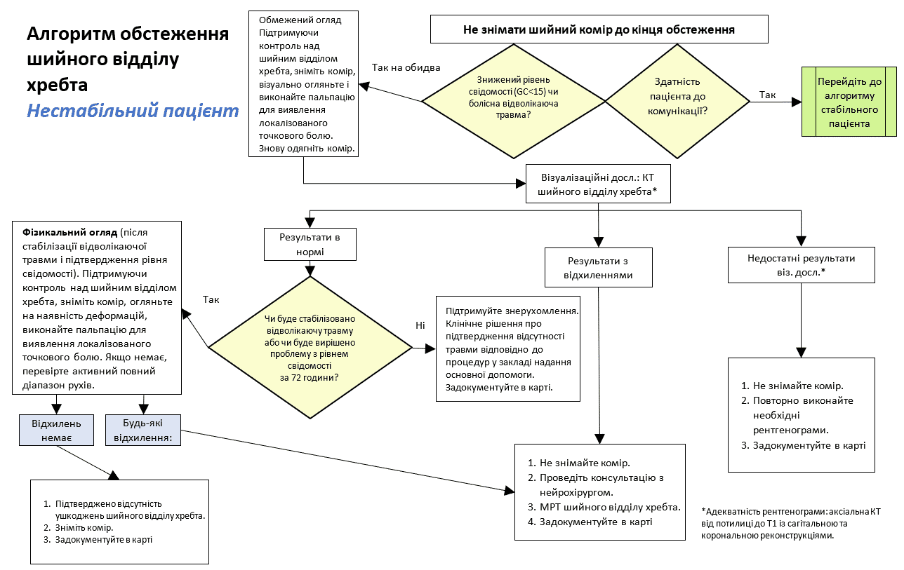 Підготовлено окремі алгоритми для стабільних (Додаток E. Алгоритм обстеження шийного відділу хребта у стабільного пацієнта) і нестабільних (Додаток F. Алгоритм обстеження шийного відділу хребта у нестабільного пацієнта).