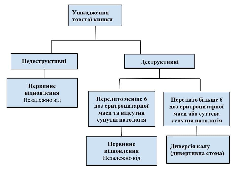 Перше, що необхідно визначити, обираючи відповідне оперативне лікування – це наявність у пацієнта недеструктивного або деструктивного ушкодження [15]. До недеструктивних ушкоджень належать травми I і II ступеня, та окремі травми III ступеня. В наш час наявні переконливі докази того, що недеструктивні ушкодження товстої кишки можна лікувати за допомогою хірургічної обробки або резекції з первинним відновленням кишки незалежно від наявності фекальної контамінації [12,13,14].