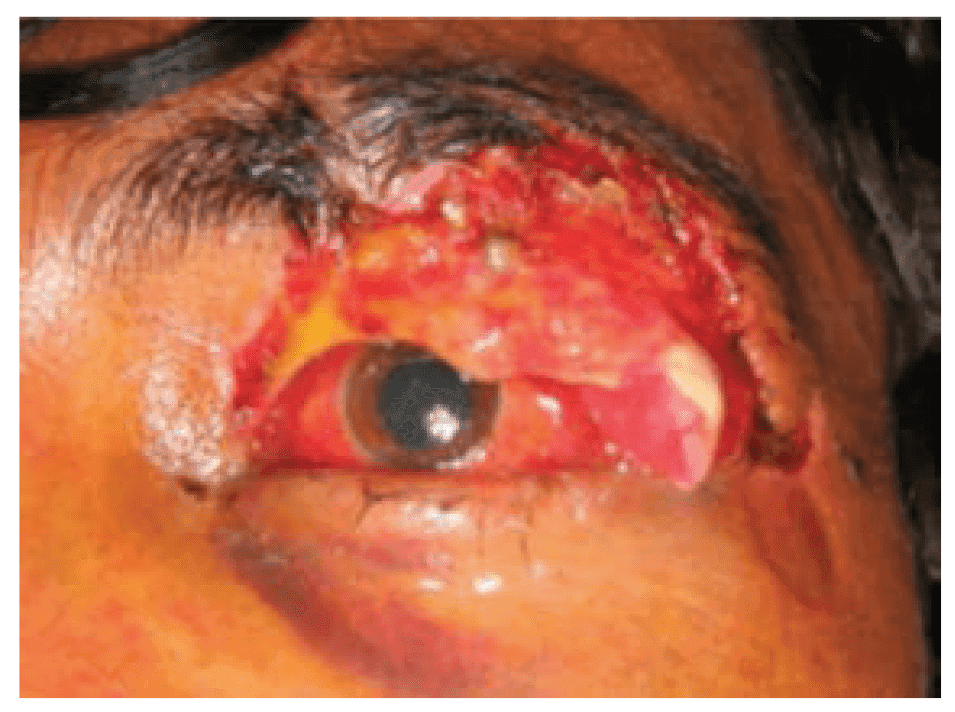 Ретробульбарний крововилив (РБК) є найпоширенішою причиною орбітального компартмент-синдрому (ОКС). Даний патологічний стан є результатом кровотечі в обмежений орбітальний простір, розміщений позаду ока, та зазвичай пов’язаний із тупою травмою (Зобр. 6 і 7). Компартмент-синдром – це загрозливий для втрати зору стан, що спричиняє підвищення тиску в оці та призводить до незворотної втрати зору. Час від підвищення тиску до повної втрати зору складає приблизно 90 хв.