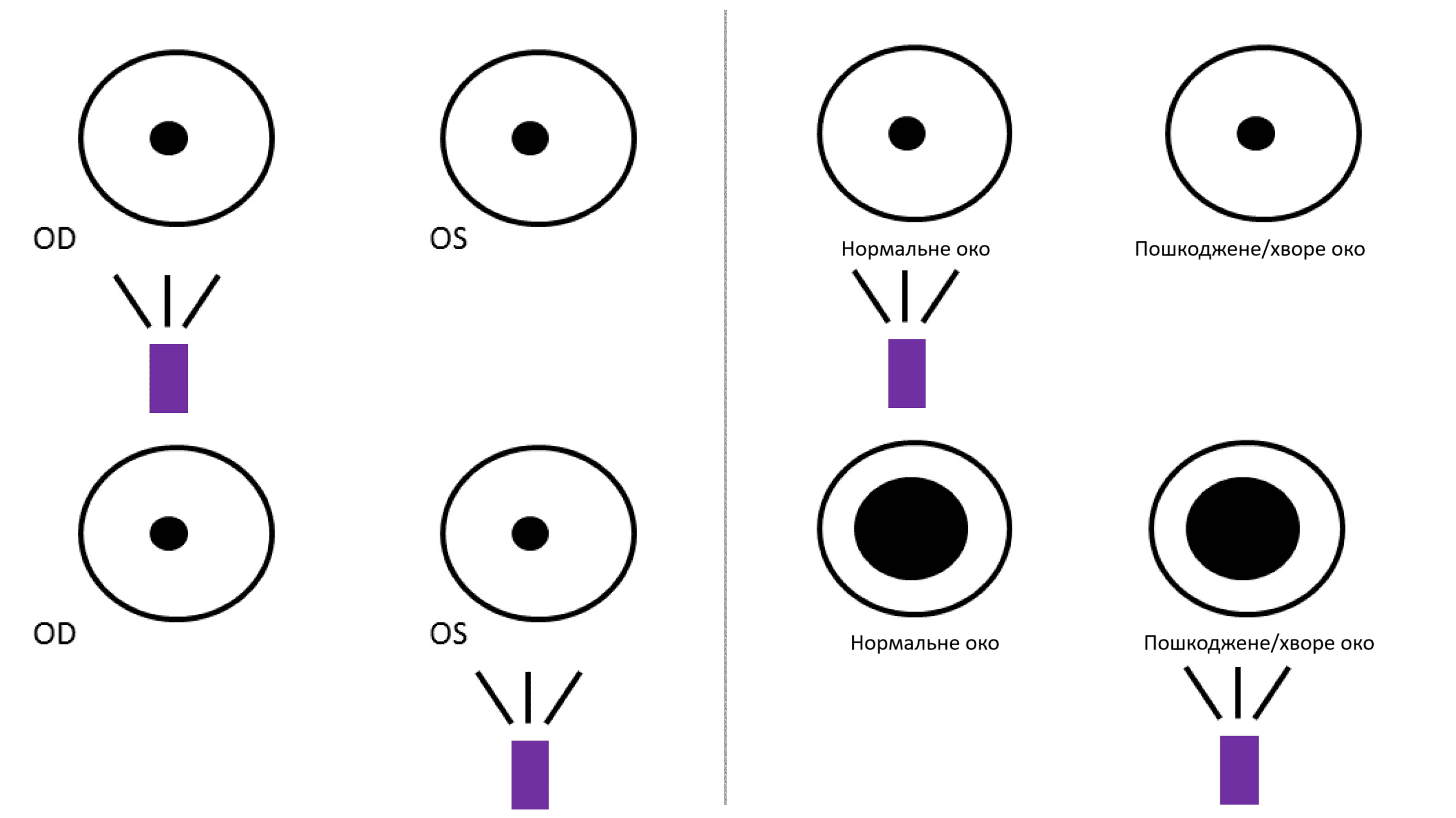 Пошкодження/захворювання зорового нерва чи сітківки ока будуть безпосередньо впливати на функцію зіниці. У нормі зіниці будуть однаково реагувати на світло через наявність узгодженого зіничного рефлексу.