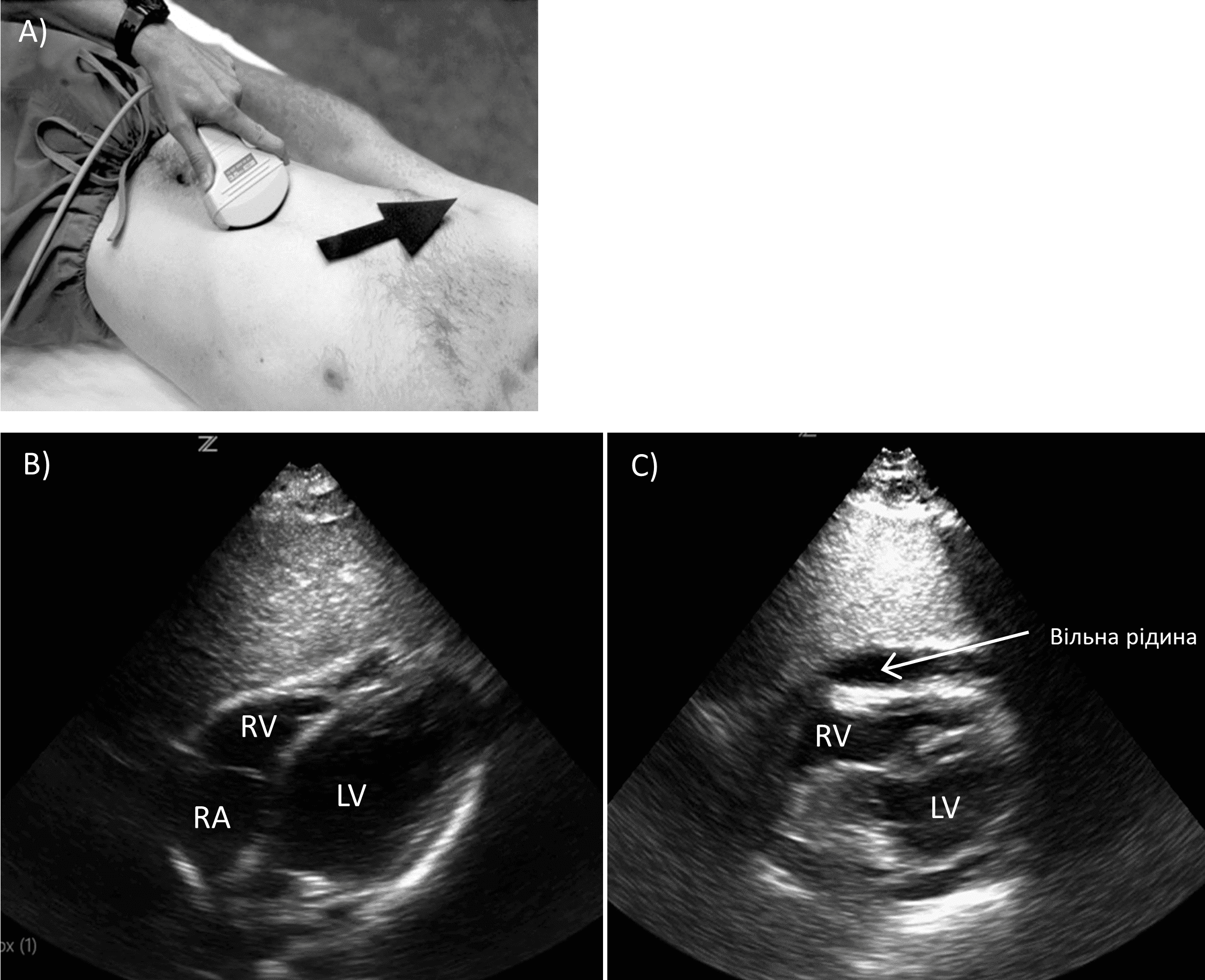 A) Позиціонування датчика. B) Норма. C) Перикардіальний випіт RV (правий шлуночок), RA (праве передсердя), LV (лівий шлуночок)