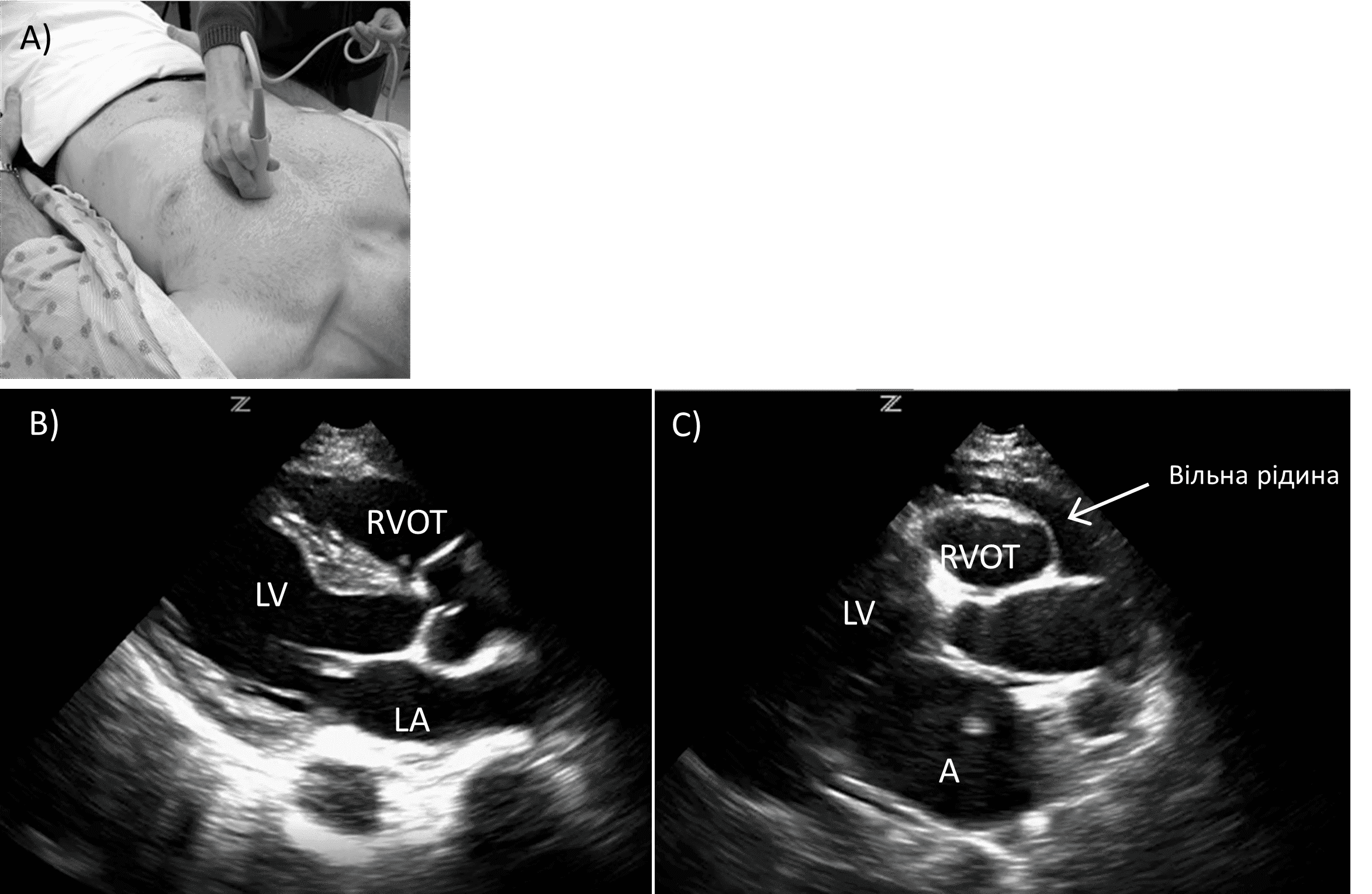 A) Розміщення датчика. B) Норма. C) Перикардіальний випіт. RVOT (вихідний тракт правого шлуночка), LA (ліве передсердя), LV (лівий шлуночок)