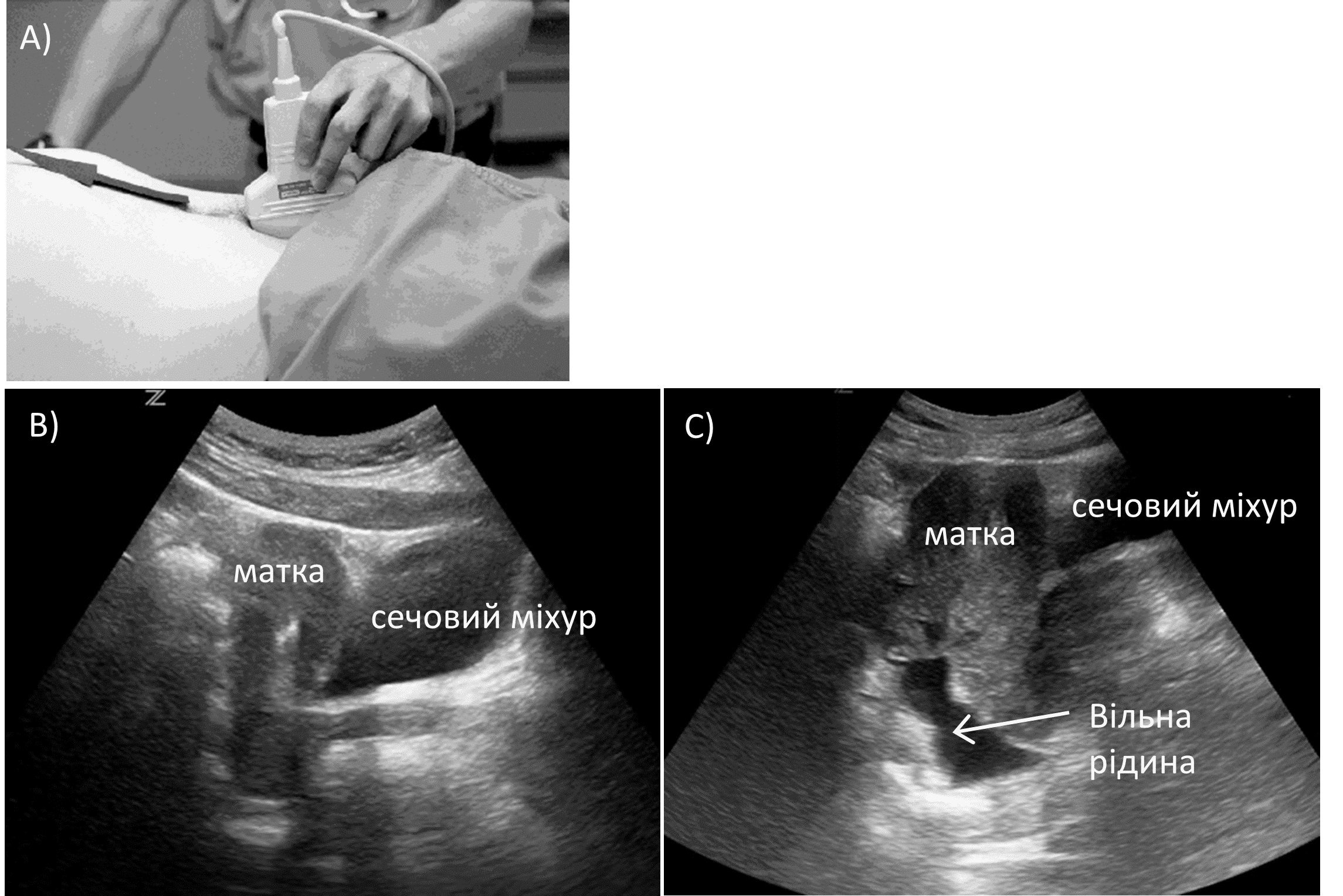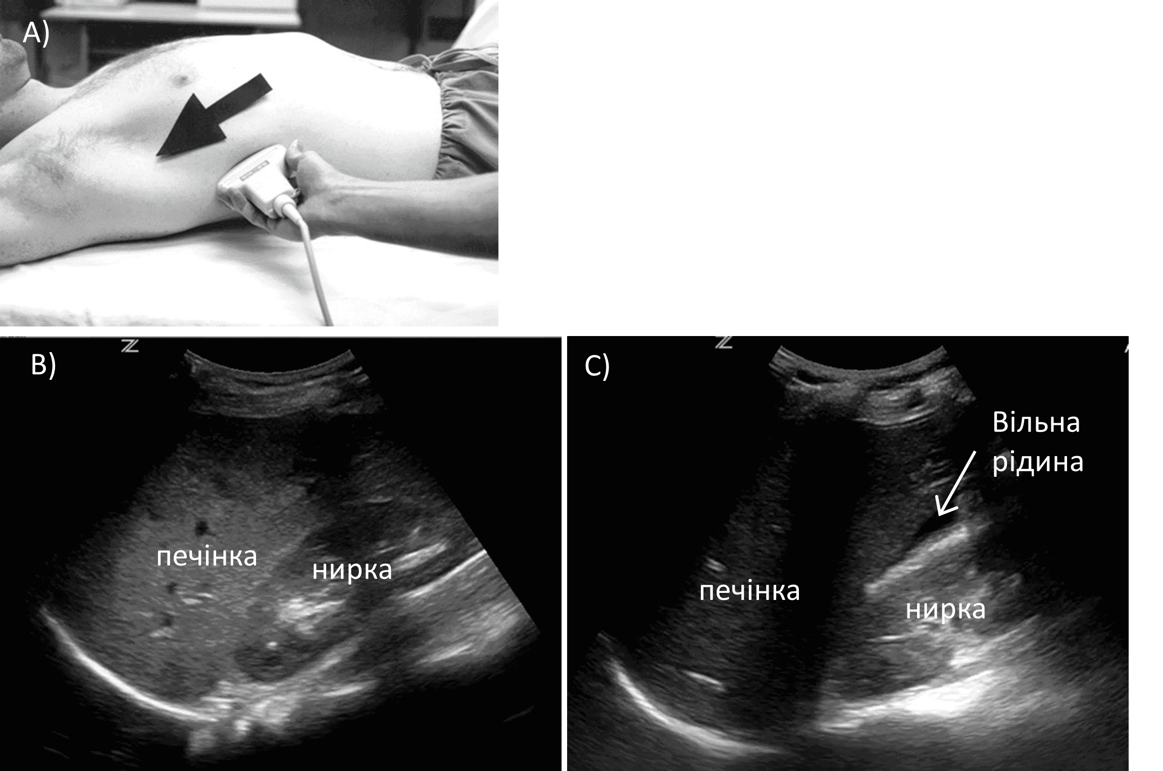A) Розміщення датчика. B) Норма. C) Позитивний FAST з вільною рідиною.