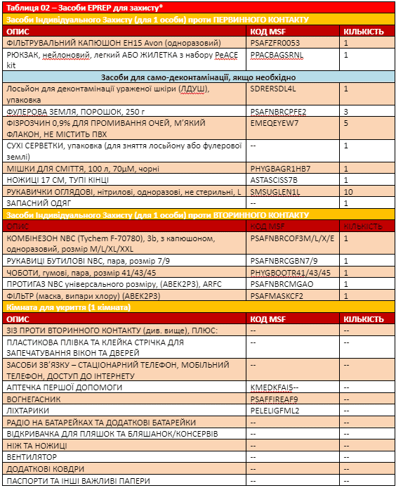 - Засоби для проведення деконтамінації. Деконтамінація має відбуватися одночасно з одяганням/натягуванням евакуаційного комплекту ЗІЗ, якщо це можливо.