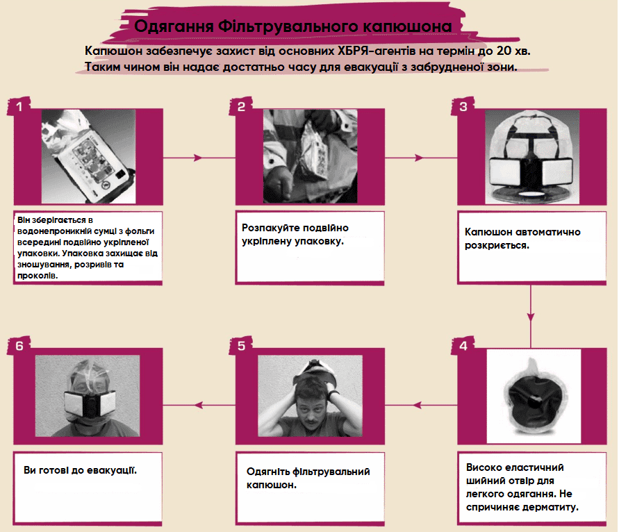 - Фільтрувальний капюшон захищає від будь-яких хімічних агентів на проміжок часу від 20 до 30 хвилин. Див. Фігуру 01.