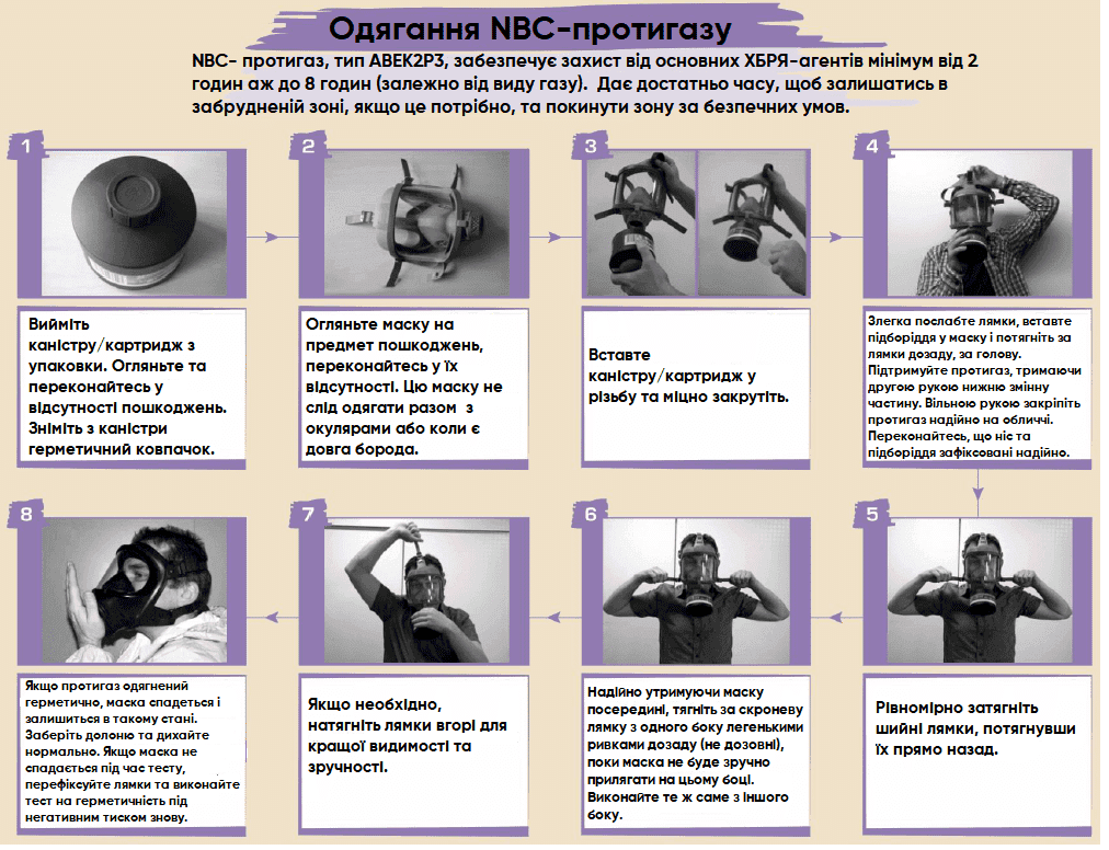 - Відповідний протигаз NBC з фільтром захищає від впливу хімічного агента впродовж 1 години. Див. Фігуру 02.