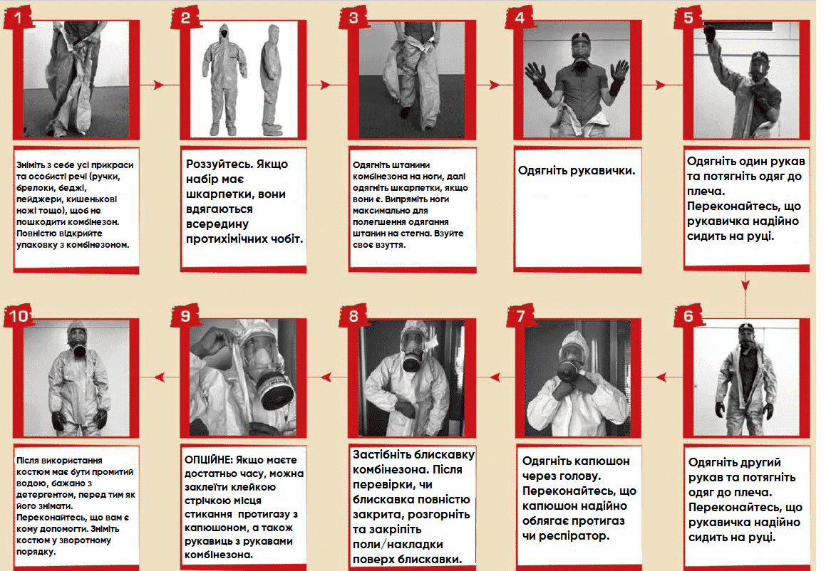 - Не знімайте захисне спорядження, допоки небезпека інгаляції отруйних речовин не мине (якщо є сумніви, залиште ЗІЗ на собі).