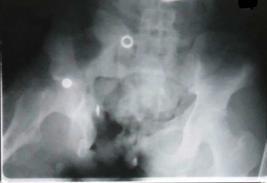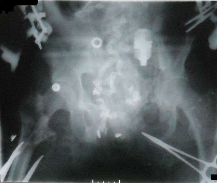 Найскладніші випадки включають відкриті переломи тазового кільця і ділянки навколо кульшової западини (Зобр. 2) та зміщення, пов’язані з тяжкими травмами промежини. Початкове ортопедичне реанімаційне втручання передбачає забезпечення достатнього контролю кровотечі з кінцівки за допомогою джгутів. Після початку інфузійної реанімації у пацієнтів часто починається кровотеча