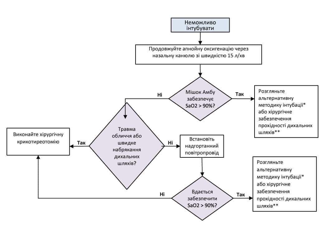 - Спробуйте виконати альтернативну методику: Оптоволоконна інтубація, відеоларингоскоп, пристрій для трансілюмінації трахеї.