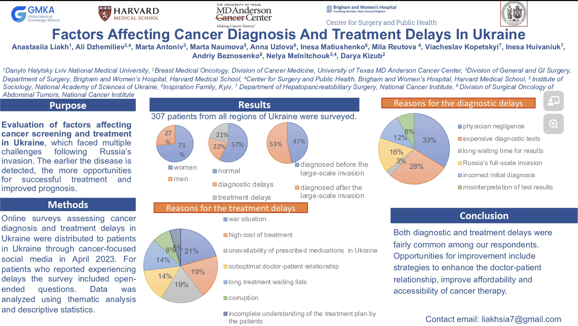 Студентка 4 курсу Львівського національного медичного університету ім. Данила Галицького Анастасія Лях представила постерну доповідь “Фактори, що впливають на діагностику раку та затримку лікування в Україні” (Factors affecting cancer diagnosis and treatment delays in Ukraine).