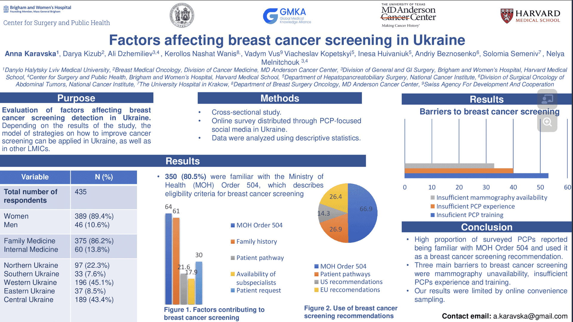 Студентка 6 курсу Львівського національного медичного університету ім. Данила Галицького Анна Каравська представила постерну доповідь “Фактори, що впливають на скринінг раку молочної залози в Україні” (Factors affecting breast cancer screening in Ukraine).