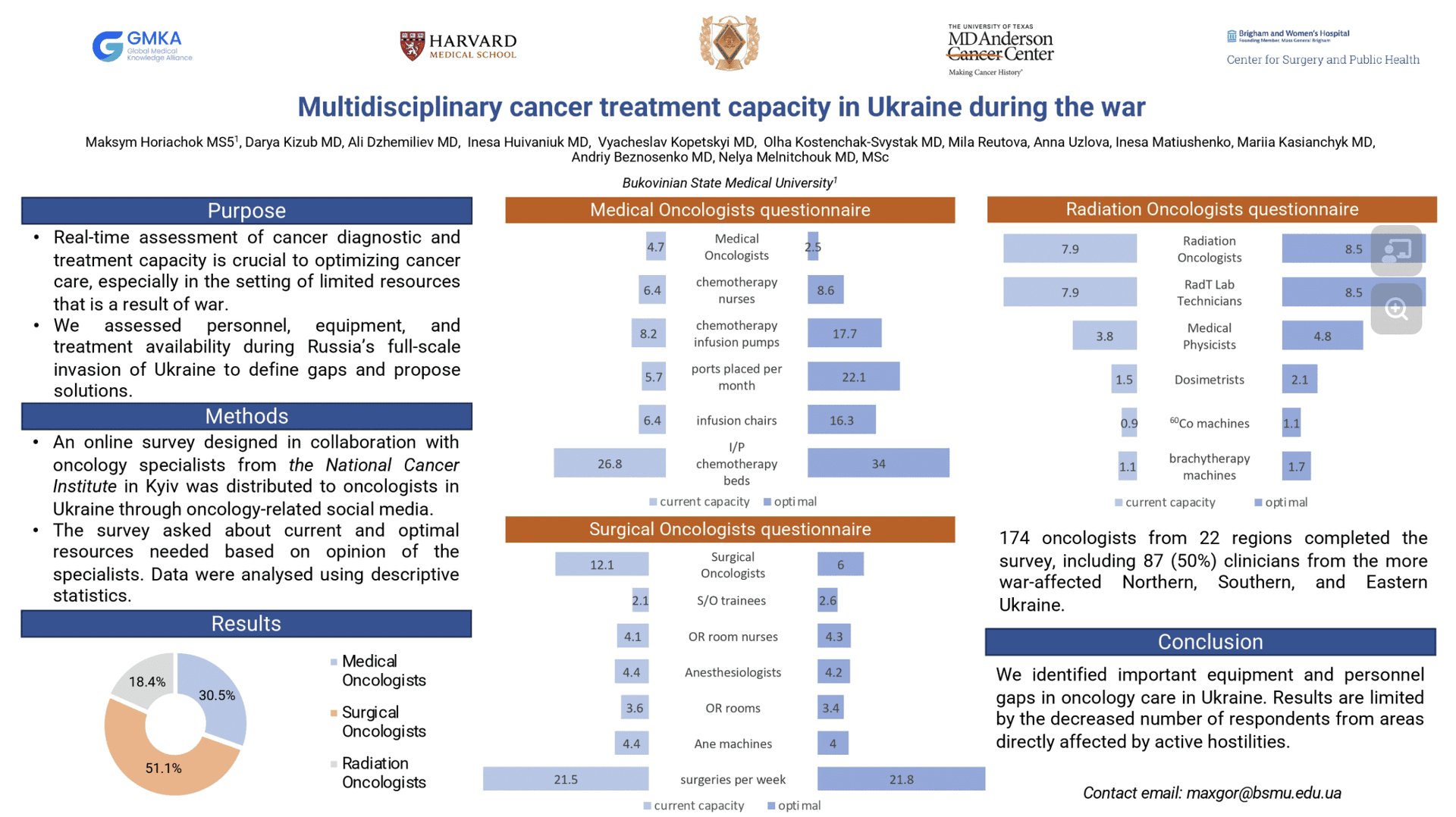 Із постерною доповіддю “Потенціал мультидисциплінарного лікування раку в Україні під час війни” (Multidisciplinary cancer treatment capacity in Ukraine during the war) виступив Максим Горячок, студент 5 курсу Буковинського державного медичного університету.
