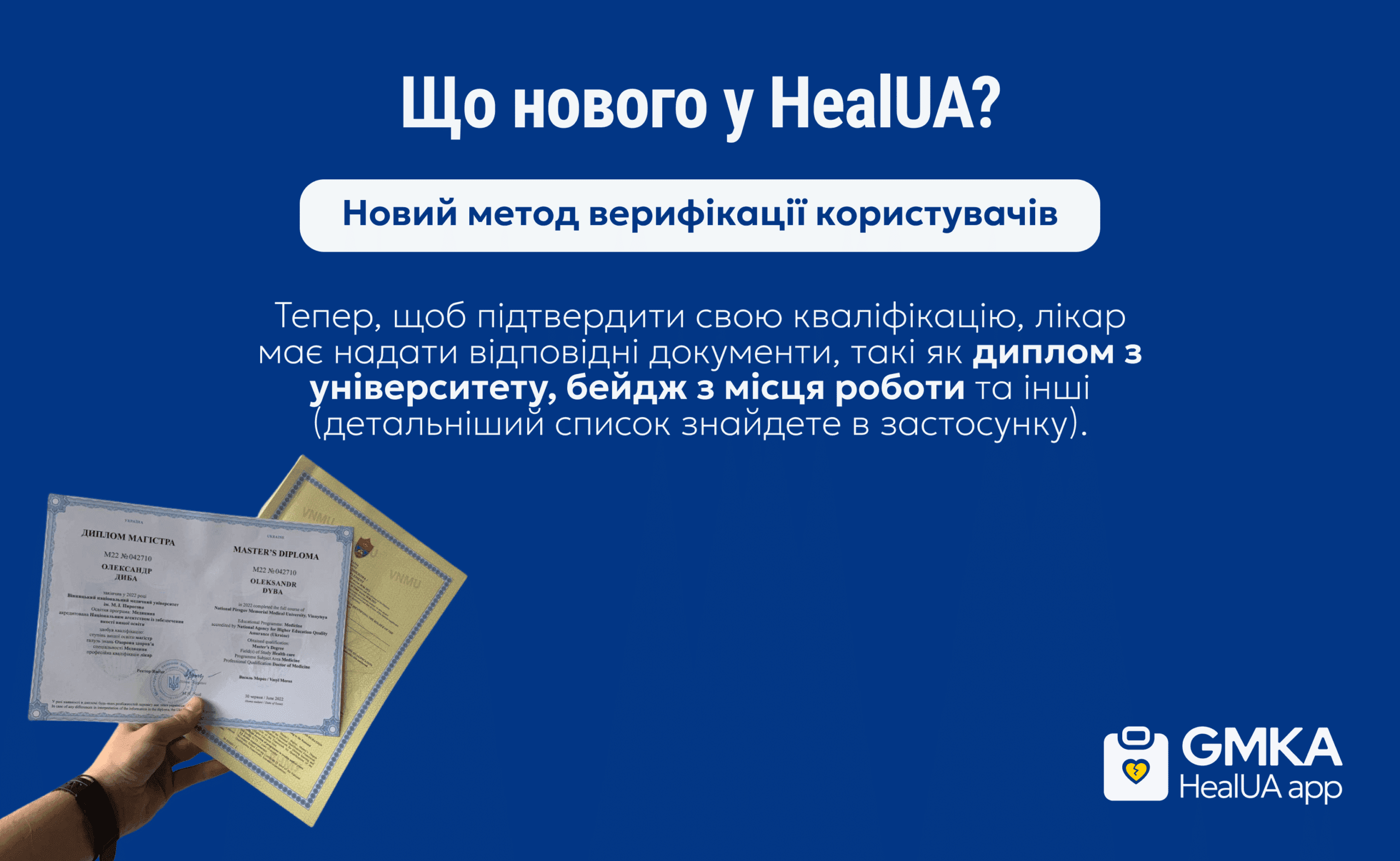 Для підвищення безпеки та надійності платформи розробники HealUA запровадили новий метод верифікації користувачів. Лікарі мають надати фото або скан-копію диплому з медичного університету, бейдж із місця роботи або інші документи для підтвердження кваліфікації. Це створює безпечніше середовище для обміну професійними знаннями та досвідом.
