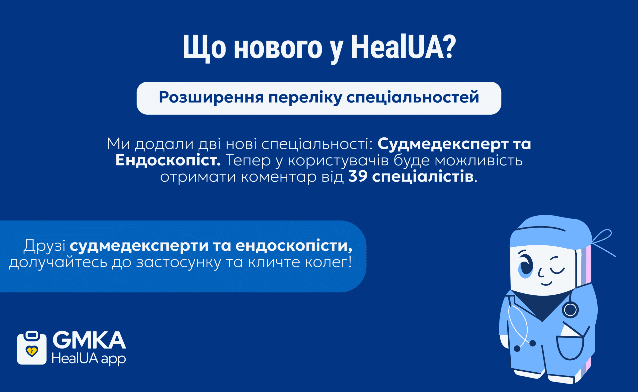 До 37 наявних спеціальностей додано дві нові: Судмедексперт та Ендоскопіст. Тепер користувачі HealUA можуть отримати коментарі від фахівців 39 медичних професій, що забезпечує ще більшу різноманітність допомоги та консультацій.